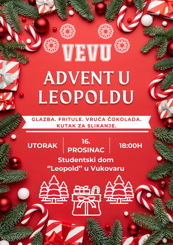 Poštovane studentice i studenti, sa zadovoljstvom vas pozivamo na Advent u Leopoldu, koji će se održati u Studentskom domu “Leopold” u Vukovaru dana 16. prosinca 2025. godine s početkom u 18:00 sati.
