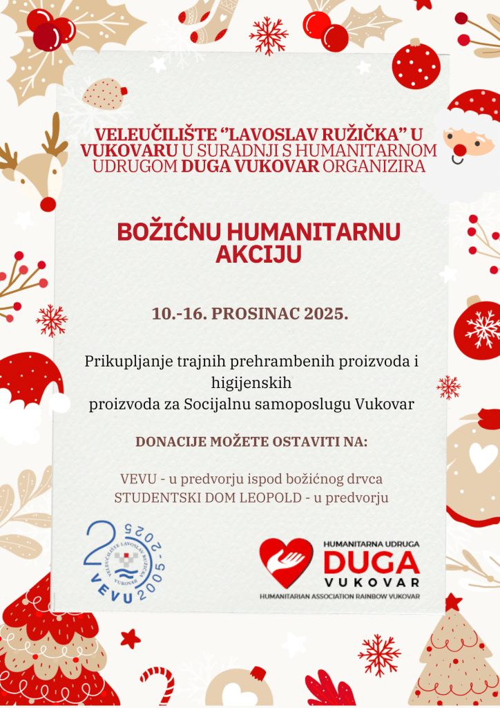 U ovo blagdansko vrijeme naše Veleučilište ”Lavoslav Ružička” u Vukovaru u suradnji s humanitarnom udrugom Duga Vukovar organizira prikupljanje hrane (trajni prehrambeni proizvodi – konzervirana hrana, tjestenina, brašno, šećer i sl.) i higijenskih potrepština za Socijalnu samoposlugu u Vukovaru.