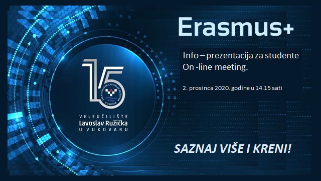 Unutar aktivnosti diseminacije Erasmus+ programa na Veleučilištu je u srijedu 2. studenog 2020. godine održan Erasmus+ Info-webinar za studente. Ovaj drugi po redu održani webinar u cilju informiranje studenata usmjeren je studentima koji su zainteresirani za mobilnosti. Erasmus koordinatorica je ovim putem uputila detaljnije informacije o načinim sudjelovanja u mobilnostima, partnerskim ustanovama dostupnim studentima kao i informacije potrebne za prijavu studenata na interne natječaje za sudjelovanje u mobilnostima i dobivanje bespovratnih potpora za provedbu mobilnosti u svrhu studija i/ili obavljanja stručne prakse.