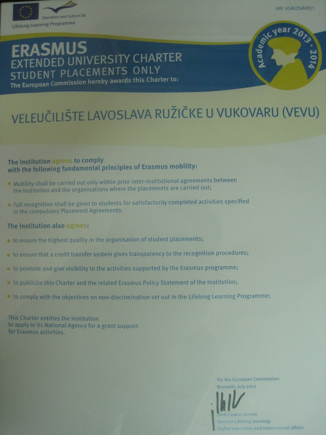 Veleučilištu Lavoslav Ružička u Vukovaru dodijeljena je Erasmus proširena sveučilišna povelja, temeljem odluke Izvršne agencije za obrazovanje, audiovizualu politiku i kulturu Europske unije (Bruxelles). Kroz Erasmus program, studentima se omogućava sufinanciranje studijskih boravaka, kao i stručna praksa u inozemstvu.