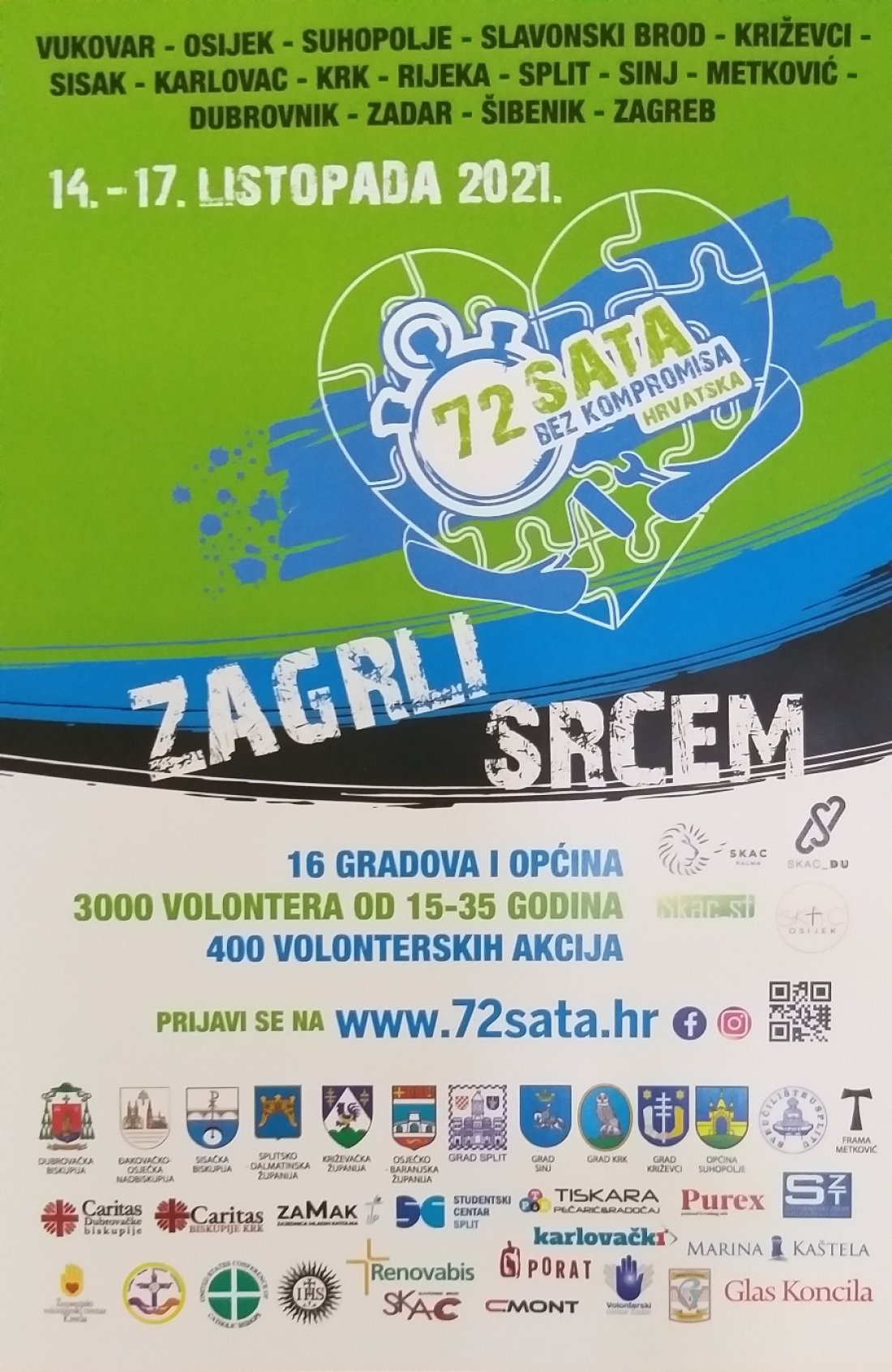 Akcija “72 sata bez kompromisa” će se ove godine po prvi puta održati i u gradu Vukovaru. Radi se o petku, 15.10. i suboti, 16.10. – može se prijaviti za jedan ili oba dana, pojedinačno ili u skupini do 3-5 osoba. Svatko od nas može biti mali kotačić pozitivne promjene u jednoj od mnogih volonterskih akcija koje će se održati diljem grada. Odvaži se i zagrli srcem one najpotrebitije među nama!”