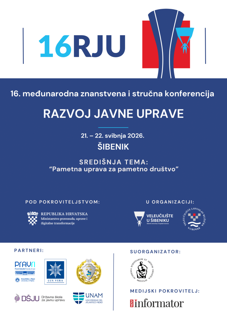 s velikim zadovoljstvom pozivamo Vas na 16. Međunarodnu konferenciju „Razvoj javne uprave“ koja će se održati u Šibeniku od 21. do 22. svibnja 2026. godine u organizaciji Veleučilišta u Šibeniku i Veleučilišta „Lavoslav Ružička“ u Vukovaru, uz suorganizaciju Zavoda za znanstvenoistraživački i umjetnički rad u Vukovaru Hrvatske akademije znanosti i umjetnosti u Vukovaru.