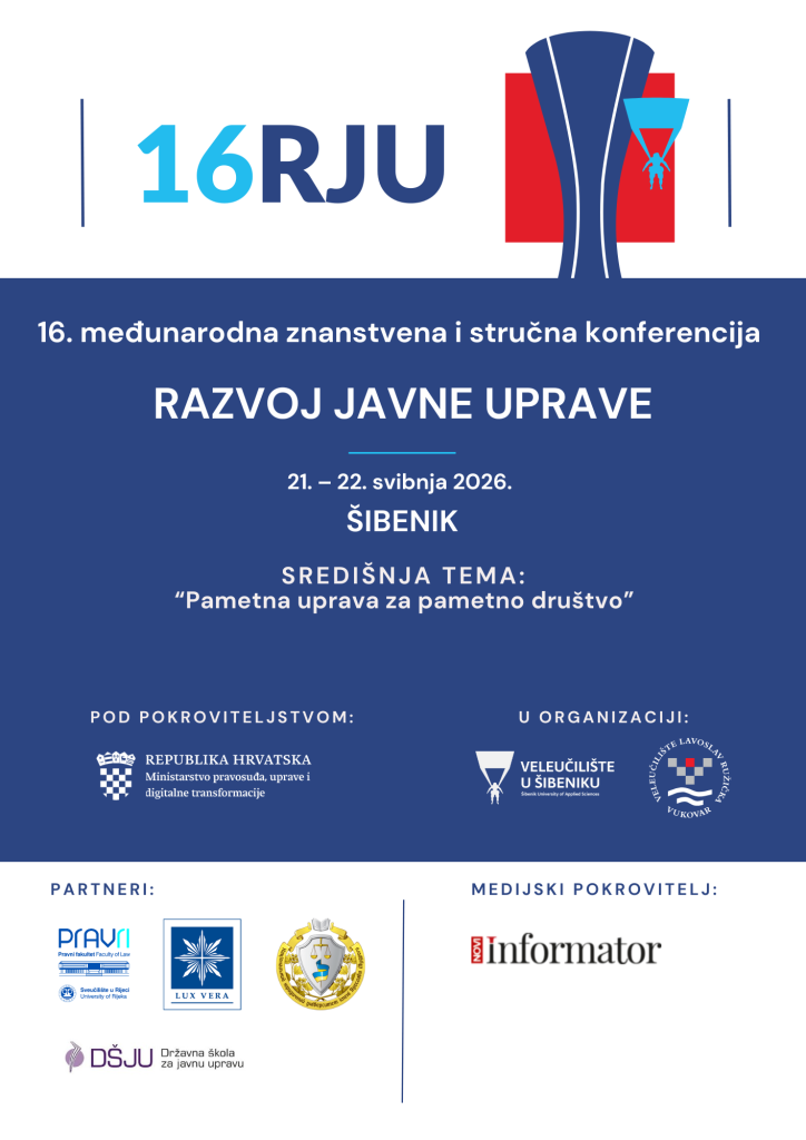 s velikim zadovoljstvom pozivamo Vas na 16. Međunarodnu konferenciju „Razvoj javne uprave“ koja će se održati u Šibeniku od 21. do 22. svibnja 2026. godine u organizaciji Veleučilišta u Šibeniku i Veleučilišta „Lavoslav Ružička“ u Vukovaru.