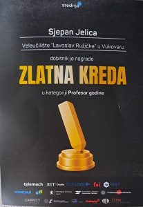 Na godišnjoj obrazovnoj konferenciji portala srednja.hr, održanoj pod nazivom Obrazovanje bez granica, dodijeljene su nagrade Zlatna kreda za najistaknutije nastavnike, učenike, studente i profesore u Hrvatskoj. U natječaju je sudjelovalo 169 prijava, a u finale je pozvano 30 finalista, među kojima je naš profesor Stjepan Jelica, predavač na Veleučilištu „Lavoslav Ružička” u Vukovaru, osvojio prestižnu titulu Profesora godine.